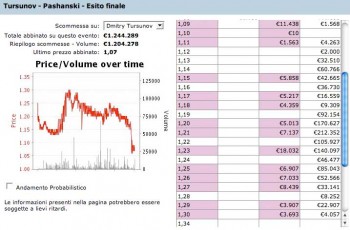 Quasi tutto il denaro scommesso è su Dmitry Tursunov. Anche quando era in svantaggio di un set e di un break, la sua quota non è mai andata oltre 1.30 (= 1 euro scommesso, 30 centesimi vinti, per il risultato momentaneo è una quota bassissima). Tuttavia sempre quando si trovava in svantaggio la quota è scesa, senza apparente motivo, tra 1.06 e 1.09 e non si è discostata fino al termine della partita (click sull’immagine per ingrandire).