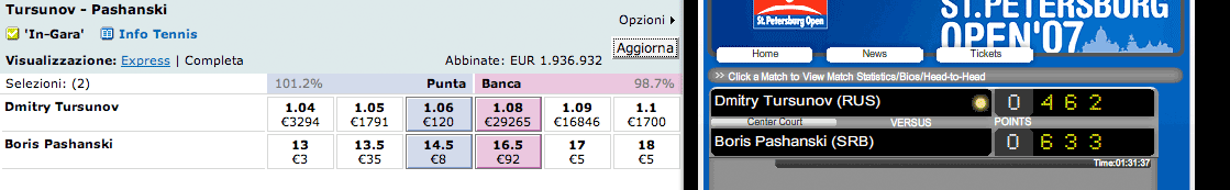 Nonostante Boris Pashanki fosse in vantaggio di un set e di un break nella seconda frazione, la quota del russo Dmitry Tursunov è scesa fino ad attestarsi a 1.06. Significa che puntando 1 euro, si sarebbero vinti solo 6 centesimi: è una quota molto bassa che sta a significare che la vittoria di Tursunov, nonostante il grave svantaggio, secondo gli scommettitori era cosa praticamente certa.