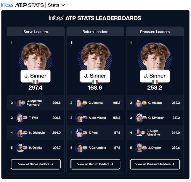 La storia invece la si costruisce con fatti e dati, certi. Il tema di quest’approfondimento non è una dietrologia sulle dinamiche del ranking, ma andare a scrutare indicatori statistici estremamente importanti che certificano quanto Jannik Sinner abbia dominato la stagione dal punto di vista tecnico e del gioco. Jannik ha stabilito un primato assoluto: da quando ogni prestazione dei tennisti sul tour Pro è “sezionata” da importanti indicatori di rendimento delle varie situazioni di gioco, con una classifica dei migliori al servizio, in risposta e nell’importantissima categoria “pressure”, ossia un indice che somma la percentuale di break point convertiti e salvati, la percentuale di tiebreak vinti e la percentuale di set decisivi vinti, non era mai accaduto che un solo giocatore primeggiasse in tutte queste categorie. Ecco la infografica di ATP che lo certifica.