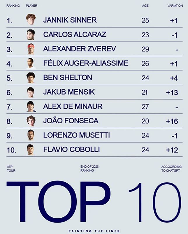 Le due più grandi sorprese sarebbero l’esplosione al massimo livello di Jakub Mensik, posizionato sesto, e di Joao Fonseca, grande promessa del Brasile all’ottavo posto a 20 anni compiuti. Out dai migliori invece Taylor Fritz, Jack Draper e anche Novak Djokovic (39enne a fine 2026). Zverev si confermerebbe terza forza del tour, seguito da Felix Auger-Aliassime, sullo slancio di una seconda parte di 2025 di grande spessore. Questo il ranking ipotizzato dall’IA secondo “Painting the Lines”.