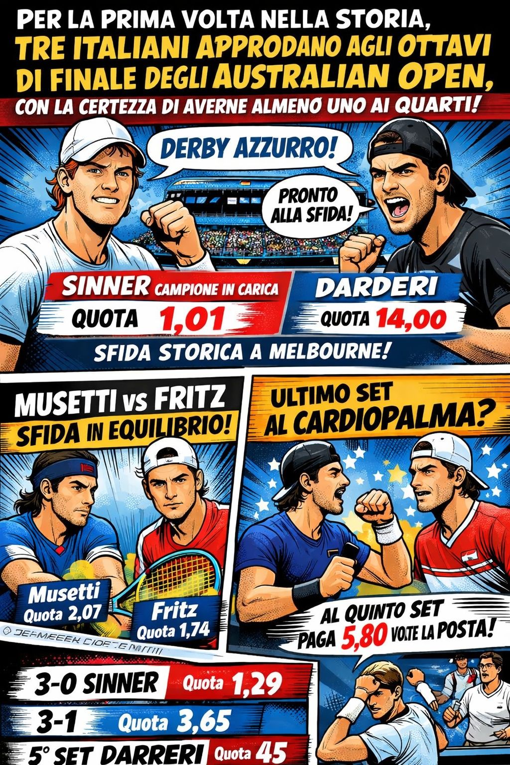 Per la prima volta nella storia, tre italiani approdano agli ottavi di finale degli Australian Open, con la certezza di averne almeno uno ai quarti. Il tabellone mette infatti di fronte, in un attesissimo derby azzurro, Jannik Sinner — reduce dalle fatiche del terzo turno contro Spizzirri — e Luciano Darderi, per la prima volta tra i migliori 16 a Melbourne.